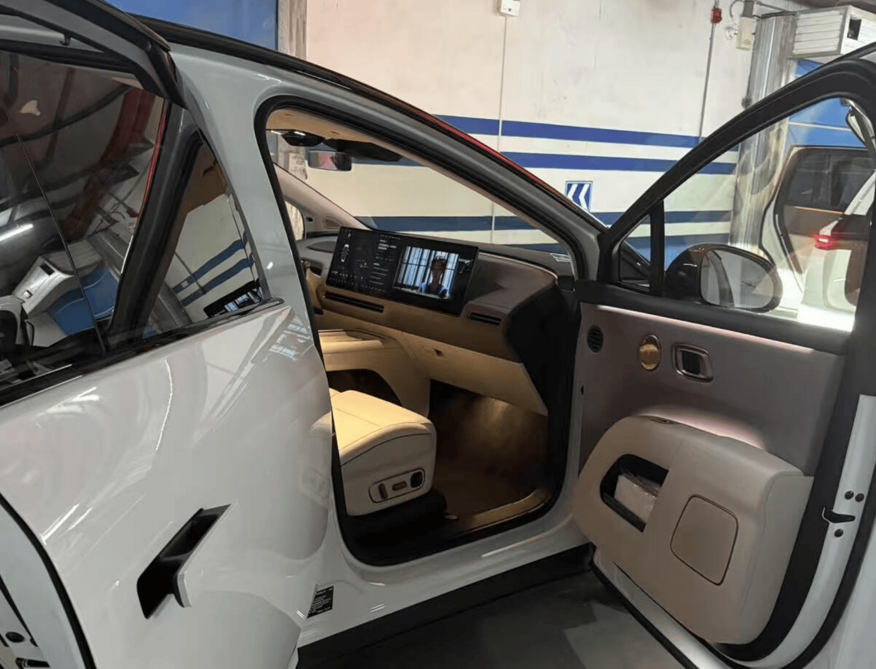 根據內飾細節圖來看,延續了家族化的雙聯屏(中控屏+副駕娛樂屏)、帶交互屏的方向盤+電子懷擋、HUD抬頭顯示等,再配合全新白/紫雙色風格以及漫反射氛圍燈,更具豪華科技氣息。車內采用2+2+2式的6座布局,后排配備雙零重力座椅、雙折疊小桌板、吸頂娛樂屏以及智能冷暖冰箱等。此外還將配備鏤空副儀表臺+手機無線充電、矩形空調出風口、三排座椅電動放倒等配置。