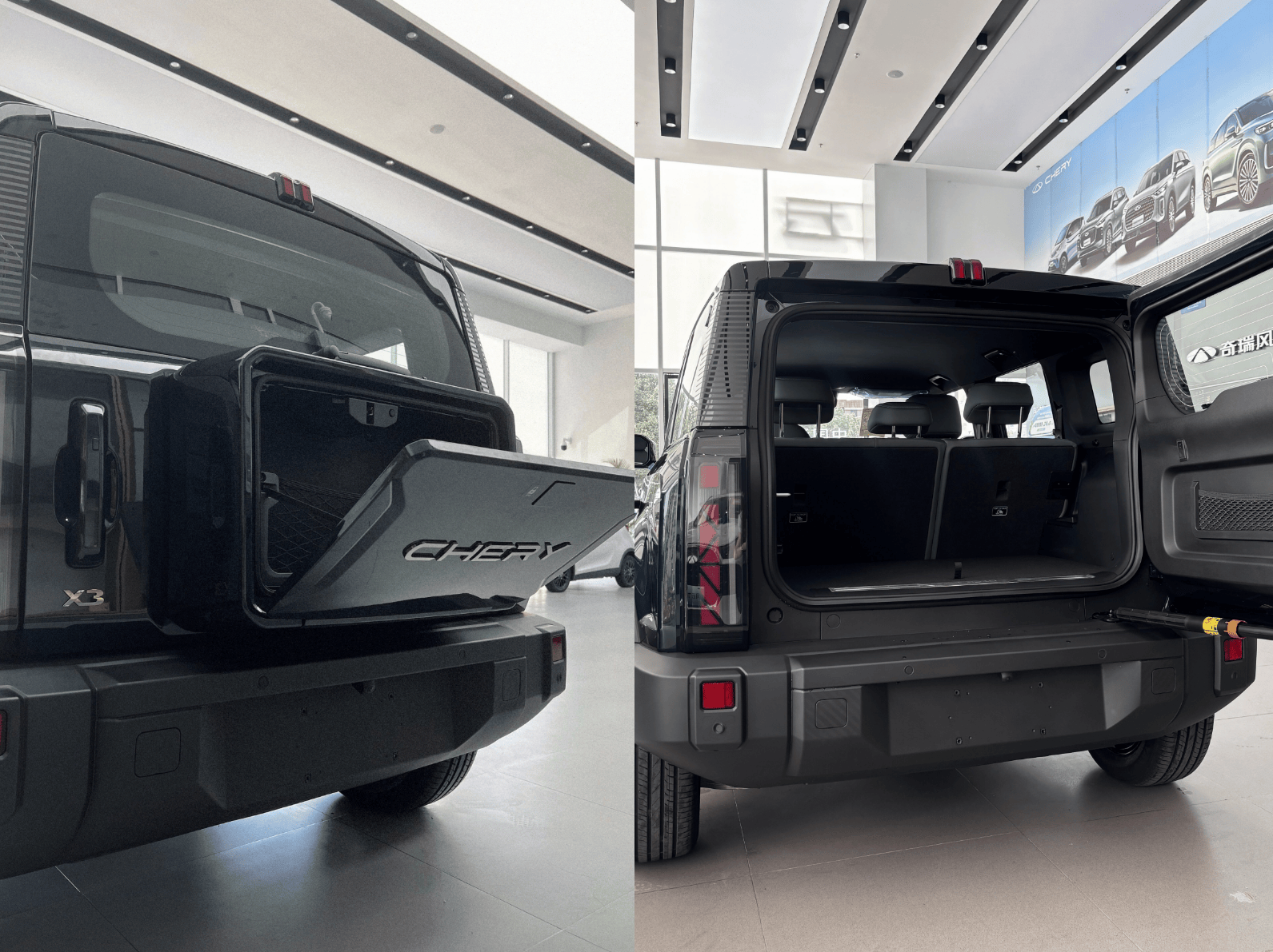 尾部的側開式尾門沒有缺席,不同的是,外掛式方盒子“小書包”上將改為“CHERY”字母標識(奇瑞),左側“X3”、右側“奇瑞風云”標識,也表明了身份。而包括“i”型尾燈、粗獷的后保險杠等,均與前臉相呼應,整體給人感覺硬派,且不乏新潮感,并繼續提供不焦綠、果然白等配色可選。