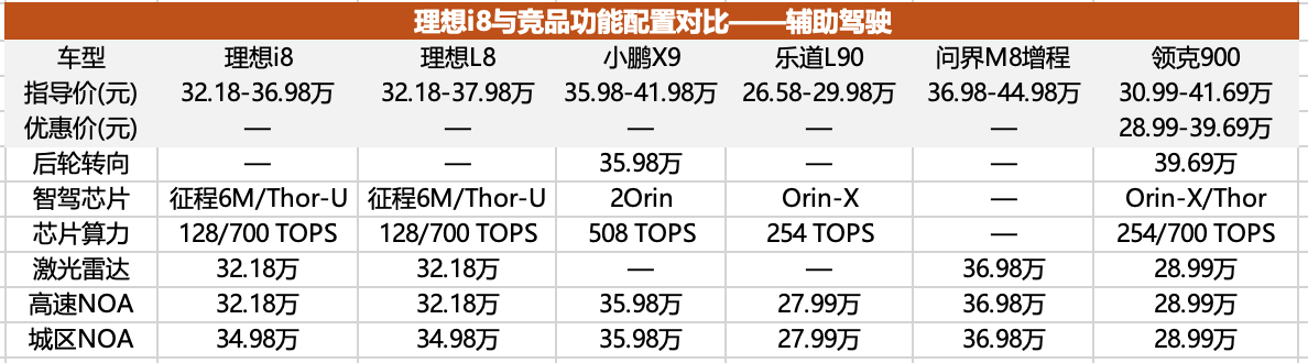 至于其它車型,和理想i8站在同一梯隊的小鵬X9和問界M8增程版,各自在36、37萬價位具備高階輔助駕駛能力,這點和34.98萬的理想i8中配相比,已經非常接近。領克900雖然也在中高配采用了Thor芯片,但目前領克在輔助駕駛方面的表現依然有明顯差距,輔助駕駛也并不是領克900客戶重點在意的地方。